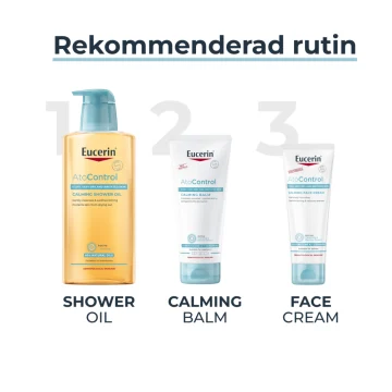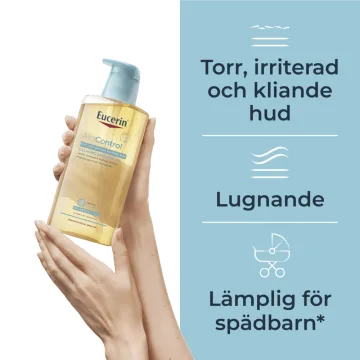 Eucerin AtoControl Calming Shower Oil är en skonsam, alkaliskt tvålfri bad- och duscholja som är berikad med en hög koncentration av Omega-3- och Omega-6-oljor för att skonsamt rengöra, återfukta och lugna känslig hud. Rengöringsoljan kan användas dagligen för hela kroppen. Kan användas som badtillsats från dag 1 hos nyfödda. Häll några droppar i badvattnet för att skapa ett mjukt löddrande och vårdande bad. 400 ml. Denna produkt har fått ett nytt utseende. Det finns fortfarande lager kvar av den gamla designen, innehållet är detsamma.