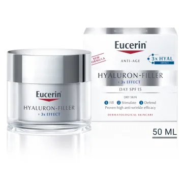 Eucerin Hyaluron-Filler + 3x Effect Day Care Dry Skin SPF15 är en dagkräm speciellt framtagen för torr hud. Den är berikad med hög- och lågmolekylär hyaluronsyra som ger intensiv återfuktning och har en plumpande effekt på fina linjer och djupa rynkor. Dagkrämen har SPF 15 och UVB- och UVA-skydd som skyddar huden mot för tidigt åldrande orsakad av solens strålar. Passar för normal till torr hud. Applicera varje morgon på väl rengjord hud. 50 ml.