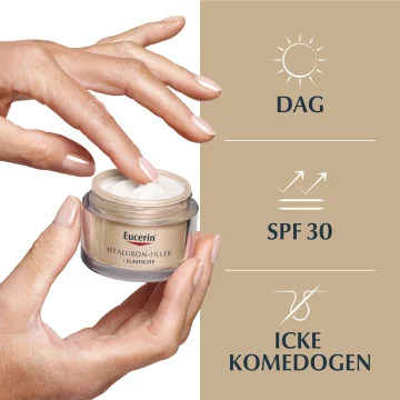 Eucerin Hyaluron-Filler + Elasticity Day Cream SPF30 är en återfuktande dagkräm som hjälper till att minska och förebygga åldersfläckar med den aktiva och patenterade ingrediensen Thiamidol. Berikad med arctiin och keratin som tillsammans stödjer hudens egen produktion av kollagen samt hjälper till att öka hudens elasticitet. Ansiktskrämen innehåller även hög- och lågmolekylär hyaluronsyra som återfuktar huden och fyller ut linjer. Innehåller även SPF30 Produkter innehållande Thiamidol används max 4 gånger per dag. 50 ml.