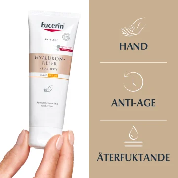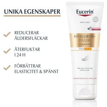 Eucerin Hyaluron-Filler + Elasticity Age Spot Correcting Hand Cream SPF30 är en handkräm som kan bidra till att reducera ålderstecken hos huden. Berikad med fuktbindande hyaluronsyra, arctiin och thiamidol. Handkrämen har även SPF30 som även skyddar huden på händerna mot ålderstecken orsakat av solens strålar. Använd dagligen för bästa resultat. Milt parfymerad. Passar alla hudtyper. 75 ml.