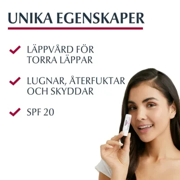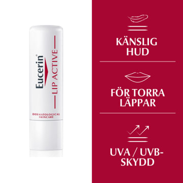 Eucerin Lip Active är ett mjukgörande läppbalsam med SPF 20 som skyddar torra, spruckna och känsliga läppar. Innehåller dexpantenol och E-vitamin som lugnar, återfuktar och skyddar läpparna. Passar alla hudtyper. 4,8 g.