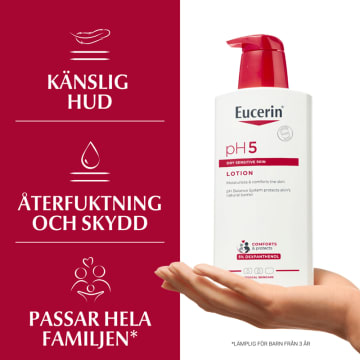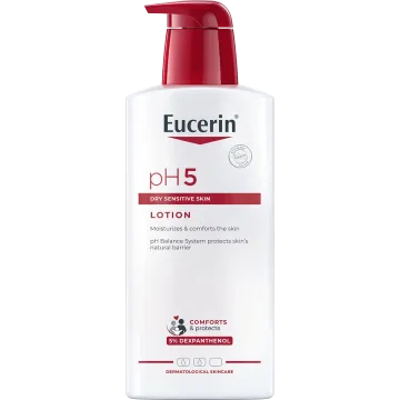 Eucerin pH5 Lotion är en parfymerad hudkräm med vårdande E-vitamin och fuktbevarande pantenol. Återfuktande fetthalt på 23% för hela kroppen. Till normal, torr och känslig hud. Använd efter dusch och bad eller vid behov. Doseringspump. 400 ml.