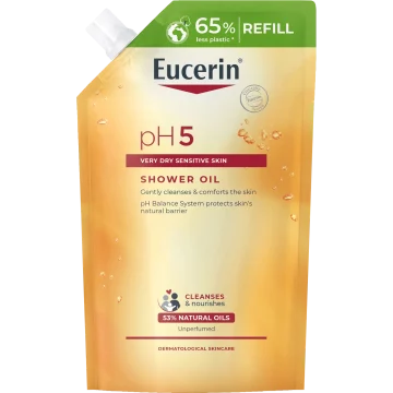 Eucerin pH5 Duscholja refill är en återfettande duscholja som skonsamt rengör. Det milda och krämiga löddret återfuktar och gör huden mjuk och len. För torr och känslig hud. Applicera lagom mängd och skölj sedan av med vatten. Refillförpackning. Oparfymerad. 400 ml.