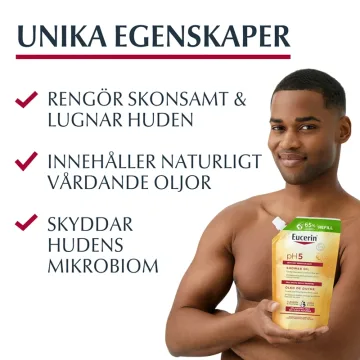 Eucerin pH5 Duscholja är en återfettande duscholja som skonsamt rengör. Det milda och krämiga löddret återfuktar och gör huden mjuk och len. För torr och känslig hud. Dosera i lagom mängd och skölj av med vatten. Refillförpackning. 400 ml.