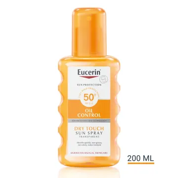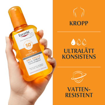 Eucerin Sun Spray Transparent SPF50+ är en solspray med oljefri, transparent formula. Enkel att smörja in, absorberas snabbt och verkar mattande. Passar alla hudtyper, även fet hy. Vattenresistent. SPF50+. 200 ml.