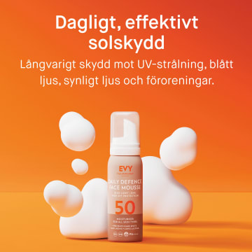 Evy Sun Daily Defense Face Mousse SPF50 är en solskyddsmousse för ansiktet som ger dig ett dagligt skydd mot UV-strålning och blått ljus, så kallad HEV-strålning. Verkar intensivt återfuktande och stärker hudens skyddsbarriär samt motverkar förtidigt åldrande av huden orsakat av solens strålar. Med en lätt formula som absorberas snabbt utan att kladda eller lämna vita fläckar på huden. Kan med fördel användas ovanpå annan hudvård, men även under make up. Berikad med mycket högt UVA-skydd i förhållande till UVB-skyddet. Utan konserveringsmedel, förpackad i en hygieniskt säker aerosolflaska. Passar alla hudtyper, även känslig hy. Vegan. Parfymfri. SPF50. 75 ml.