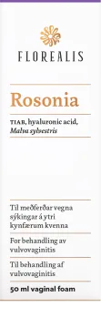 Florealis Rosonia är ett växtbaserat skum som är avsett för lokalbehandling av underlivet. Rosonia är en behandling för vulvovaginit/slidkatarr som verkar från första symtomen. Den ger snabb symtomlindring vid klåda, sveda och obehag. Rosonia bildar en filmliknande barriär i underlivet som det drabbade området mot mikrobiella angrepp, förhindrar att infektionen sprider sig. Malva sylvestrisextrakt och hyaluronsyra ger en lugnande, mjukgörande och återfuktande effekt i underlivet. Skum. Medicinteknisk produkt, klass IIb. 50 ml.