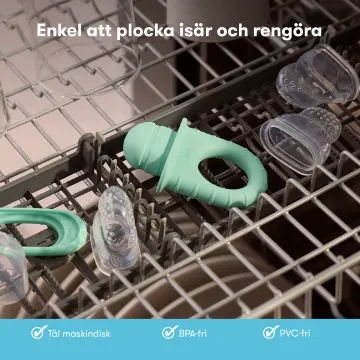 Denna produkt ska alltid användas under uppsikt av en vuxen och inspekteras före varje användning; vid första tecken på skada ska produkten kasseras. Produkten är varken en leksak eller bitring och ska endast användas enligt avsikt. Eftersom produkten innehåller smådelar finns risk för kvävning, och dess skick bör regelbundet kontrolleras; användningen ska upphöra om produkten är utsliten, skadad eller repad av nyframkomna tänder. Barn får aldrig lämnas utan tillsyn med produkten. Produkten får inte placeras i frysen. Det finns risk för skåll- eller brännskada, därför ska både matens och produktens temperatur kontrolleras för säkerhet före användning. Produkten är inte avsedd för att administrera läkemedel eller att användas tillsammans med andra produkter, och får inte hängas i snören eller andra upphängningsanordningar. Rådgör med kvalificerad läkare innan nya livsmedel introduceras i barnets kost. Maten ska inte värmas medan den befinner sig i produkten.