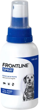 Frontline vet kutan spray lösning mot fästingar, loppor och löss på katt och hund. Skyddar mot loppor upp till 5 veckor hos katt och upp till 12 veckor hos hund. Skyddet mot fästingar varar i upp till 2 veckor hos katt och upp till 5 veckor hos hund. Kan även användas till dräktiga och digivande katter och hundar samt kattungar och valpar från 8 veckors ålder. Receptfritt läkemedel. Läs alltid bipacksedel innan användning.