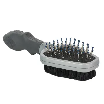 FURminator Dual Grooming Brush är en två i ett borste för hund och katt över 1 år och inte har valppälsen kvar. En sida för hårdare borstning med hållbara metalltänder som är lämplig för att reda ut tovor, kamma ur skräp och ge massage med piggarnas platshuvuden. Andra sidan för mjukare borstning med vildsvinshår som gör överpälsen jämn och glansig. Skonsam borstning för pälsen och djuret. Ergonomiskt och greppsäkert handtag för skön komfort och maximal kontroll.