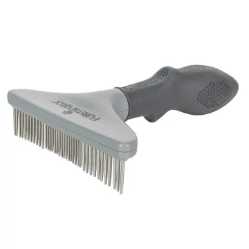 FURminator Grooming Rake är en pälskam för hund och katt med tjock päls eller dubbla pälslager. Pälsvårdverktygen hjälper till att ta bord löst hår, tovor och trassel samt reder ut pälsen. Roterande metalltänder som tar bort löst hår från underullen och förhindrar tovor och knutar i tät päls. Kammen har ett greppsäkert och ergonomiskt grepp i gummi.