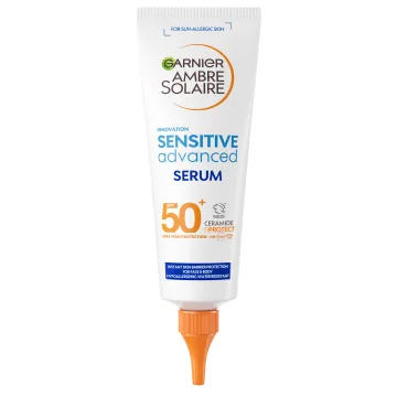 Garnier Ambre Solaire Sensitive Advanced Body Serum SPF50+ är en solkräm med SPF 50+ framtagen för känslig hud som passar för både ansikte och kropp. Den är berikad med ceramider som hjälper till att skydda hudens barriärfunktion. Solkrämen har en hypoallergen formula och är framtagen för känslig hud. Den har en lätt konsistens och passar extra bra att använda på områden som lätt blir solskadade som nacke, bröst och armar. Oparfymerad. 125 ml.