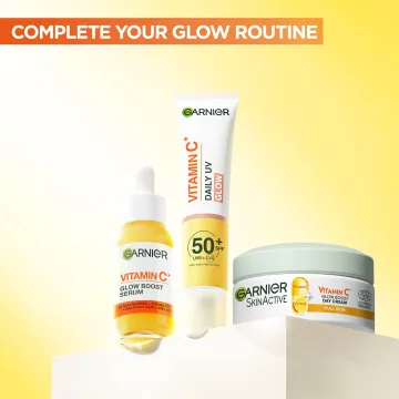 Garnier SkinActive Vitamin C Glow Boost Day Cream är en lystergivande och återfuktande dagkräm. Den är berikad med koncentrerad C-vitamin och super citrus som ger lyster och kan bidra till en jämnare hudton. Ansiktskrämen innehåller även glycerin som mjukgör huden och motverkar uppkomsten av fina linjer och gör att huden känns uppstramad. 50 ml.