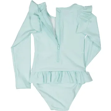 Geggamoja Långärmad UV Baddräkt 50+ Mint är en baddräkt tillverkad i snabbtorkande material med UV-skydd 50+. Långärmad modell som ger extra skydd mot solens farliga UVA- och UVB-strålar. Söt design med volang vid midja och axlar, och praktisk dragkedja i ryggen.