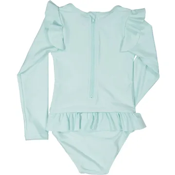 Geggamoja Långärmad UV Baddräkt 50+ Mint är en baddräkt tillverkad i snabbtorkande material med UV-skydd 50+. Långärmad modell som ger extra skydd mot solens farliga UVA- och UVB-strålar. Söt design med volang vid midja och axlar, och praktisk dragkedja i ryggen.