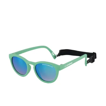 Geggamoja Solglasögon Barn 2-6 år Grön är mjuka och följsamma solglasögon i snygg design. Med en praktisk resårsnodd som enkelt sätts kring huvudet för att solglasögonen ska sitta på plats. Snodden kan tas av och justeras i storlek med hjälp av spännerna längst ut på skalmarna. Tillverkade i mjuk silikon som är ett både bekvämt och tåligt material. CE-märkta med UV 400 som blockerar alla skadliga UVA- och UVB-strålar och mörka glas i filterkategori 3. Bredd 13 cm, passar barn 2–6 år.