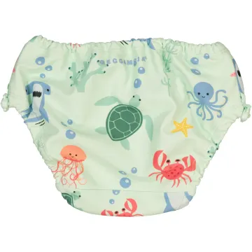 Geggamoja UV-Baby Badbyxa Havsdjur är badbyxor för små barn med UV50+ som blockerar 98% av solens farliga UVA- och UVB-strålar. Badblöjan är försedd med justerbar resår med dragsko i midjan och benöppningen för att se till att den sitter bekvämt och säkert. Det behövs ingen extra blöja eller inlägg under badblöjan då den håller tätt även när den är blöt. Gjord i snabbtorkande material i söt design med havsdjur. Tillverkad i återvunnen polyester.