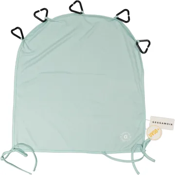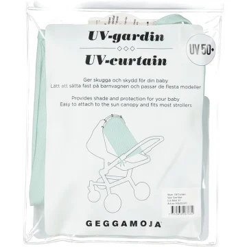 Geggamoja UV Curtain Mint är en solskyddande gardin med UV50+ som smidigt fäster sig på barnvagn och bilstol/babyskydd med hjälp av plastringar som krokar. Praktisk UV-gardin i mjukt tyg som andas och blockerar 98% av solens UVA och UVB-strålar. Smart lösning som underlättar att hålla solens strålar borta från små barn. Passar alla barnvagnar.