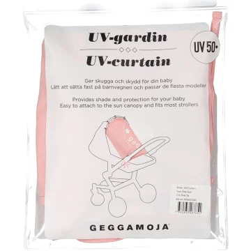 Geggamoja UV Curtain Pink är en solskyddande gardin med UV50+ som smidigt fäster sig på barnvagn och bilstol/babyskydd med hjälp av plastringar som krokar. Praktisk UV-gardin i mjukt rosa tyg som andas och blockerar 98% av solens UVA och UVB-strålar. Smart lösning som underlättar att hålla solens strålar borta från små barn. Passar alla barnvagnar.