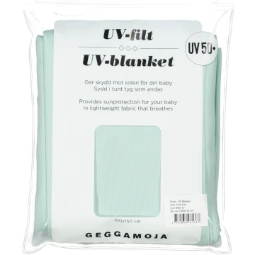 Geggamoja UV Filt 50+ Mint är en mjuk och tunn filt med UV-skydd 50+. Perfekt att använda som solskydd över barnvagnen, att ta med på strandutflykten eller använda som amningsfilt. Filten blockerar 98% av solens skadliga UVA- och UVB-strålar. Tillverkad i 100% återvunnen polyester mesh, ett material som andas och torkar snabbt. Filten har en härligt mintgrön färg som lätt kombineras med andra UV-produkter från Geggamoja. Storlek 100x150 cm.