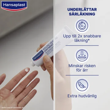 Hansaplast Wound Healing Ointment är en salva som kan bidra till en snabbare sårläkning. Ger optimal sårläkningsmiljö och kan även minska risken för ärrbildning. Även lämplig för spädbarn. Passar alla hudtyper. 20 g.