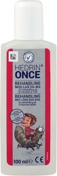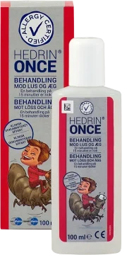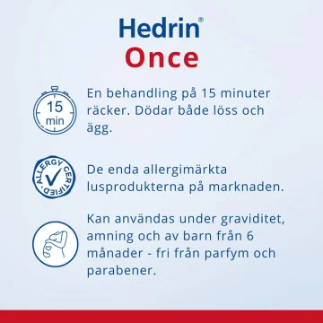 Gnuggas in i torrt hår, ända ner i hårbotten. Låt det verka i 15 minuter. Låt håret lufttorka (får ej fönas). Kamma inte håret medan behandlingen verkar. Direkt efter behandlingen ska man använda schampo. Det är viktigt, att schampot appliceras före vattnet, annars kan det vara svårt att skölja Hedrin® Once ur håret.