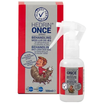 Hedrin Once Spray är ett lusmedel som bara behöver användas en gång för maximal effekt. Med en lättflytande gel-formula som enkelt sprayas och fördelas jämt över håret och tvättas ur efter bara 15 minuter. Produkten dödar både löss och ägg. Kan användas av vuxna och barn från 6 månaders ålder, även lämplig för gravida och ammande.