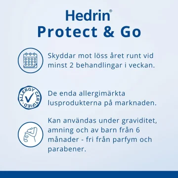 Hedrin Protect & Go Spray är en lättanvänd och skyddande lusbehandling som sprayas enkelt i torrt hår och som inte ska tvättas ur. Passar för den som har löss i sin närhet och vill undvika att bli smittad. Förutom att sprayen dödar lössen fungerar den också som balsam i håret och motverkar hårtrassel. Två behandlingar i veckan skyddar mot löss året runt. Allergimärkt och passar barn från 6 månaders ålder. 120 ml.