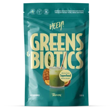 Heey! Greens & Biotics Superfood Tropical är ett dagligt tillskott som innehåller vitaminer, mineraler och antioxidanter. Greens & Biotics formula består bland annat av gröna och röda växter, prebiotika och probiotika. Den innehåller även vitaminer och mineraler som C-vitamin, D-vitamin, vitamin B6 och B12 samt zink och selen. C-vitamin bidrar till immunsystemets normala funktion och minskad trötthet och utmattning. Zink och Selen bidrar till immunsystemets normala funktion och att skydda cellerna mot oxidativ stress. De gröna växterna är en blandning av spenat, spirulina, chlorella, broccoli och moringa, medan de röda består av açaí, blåbär, granatäpple och vattenmelon. Tillskottet har en frisk och söt smak, helt utan tillsatt socker. Tillverkad i Sverige. Vegansk. 300 g.