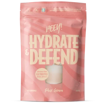 Heey! Hydrate & Defend Elektrolyter Rosa Grapefrukt är en elektrolytblandning med bland annat magnesium, zink och ingefära. Blandningen hjälper till att stödja kroppens vätskebalans och innehåller mineraler som magnesium, natrium, kalium samt C-vitamin och D-vitamin. Vitamin D bidrar till immunsystemets normala funktion, medan zink hjälper till att skydda cellerna mot oxidativ stress. Varje portion innehåller dessutom 1 miljard probiotiska bakterier. Den passar utmärkt vid intensiva träningspass, perioder utan tillräckligt vätskeintag eller om du ofta dricker vätskedrivande dryck. Utan tillsatt socker. Vegansk. 240 g.
