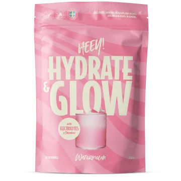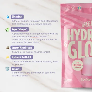 Heey! Hydrate & Glow Elektrolyter Vattenmelon är en elektrolytblandning med vegansk kollagenformel Coll-egan®. Coll-egan® är en patenterad, 100% växtbaserad ingrediens. Ett effektivt alternativ till traditionellt kollagen och speciellt framtaget för att stödja kroppens egen produktion av kollagen. Elektrolytmixen innehåller viktiga mineraler som magnesium, natrium och kalium. Den innehåller även hyaluronsyra, coenzym Q10 och E-vitamin. Veganskt och utan tillsatt socker. 240 g.