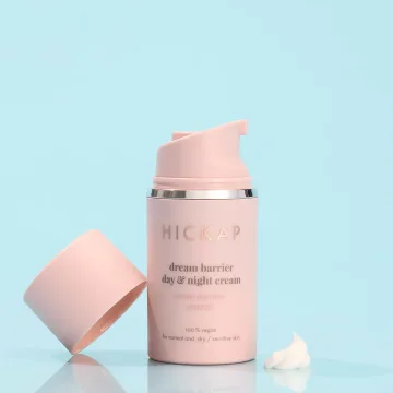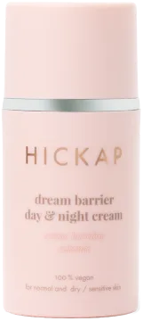Hickap Dream Barrier Day & Night Cream är en barriärstärkande dag- och nattkräm. Ansiktskrämen hjälper till att förbättra hudens fasthet och elasticitet samtidigt som den återfuktar huden. Fuktkrämen innehåller det tre-lipidkomplexet av ceramider, kolesterol och lipider som hjälper till att stärka hudens skyddslager och stödja dess naturliga reparationsprocess. Ansiktskrämen innehåller även hyaluronsyra som verkar fuktgivande samt sheasmör och vårdande växtoljor som kapslar in näringen och bidrar till att lugna känslig och irriterad hud. Ansiktskrämen har en lätt och snabbt absorberande konsistens som är lätt att massera in i huden. 50 ml.