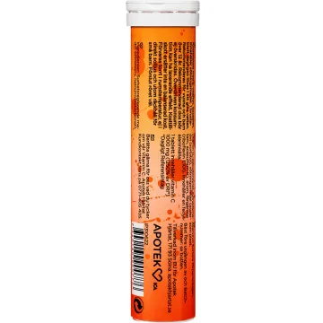 Syra (citronsyra), vitamin C (L-askorbinsyra), surhetsreglerande medel (natriumvätekarbonat), fyllnadsmedel (sorbitol), naturlig arom (apelsin), sötningsmedel (aspartam*, acesulfam K), färgämne (riboflavin). *Innehåller sötningsmedel. Innehåller aspartam (en källa till fenylalanin). 1 brustablett innehåller: 1000mg (1250% av DRI*) C-vitamin. *Dagligt Referensintag.