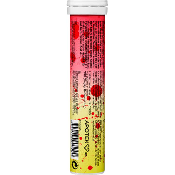 Syra (citronsyra), vitamin C (L-askorbinsyra), surhetsreglerande medel (natriumvätekarbonat), fyllnadsmedel (sorbitol), arom (granatäpple), sötningsmedel (aspartam*, acesulfam K), rödbetspulver, naturlig arom (lime), färgämne (riboflavin). *Innehåller aspartam (en källa till fenylalanin). 1 brustablett innehåller 1000mg (1250% av DRI*) C-vitamin. *Dagligt Referensintag.