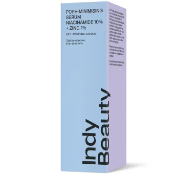 Indy Beauty Pore-minimising Serum Niacinamide 10%+Zinc 1% är ett fuktgivande ansiktsserum som kan ge en porsammandragande effekt. Berikat med 10% niacinamid, 1% zink och extrakt från pilbark som är en naturlig källa till BHA. Kan bidra till att förbättra hudens elasticitet samt motverka uppkomsten av pormaskar. Appliceras på rengjord hy, innan din dagkräm. Passar alla hudtyper. Parfymfri. Vegan. 30 ml.