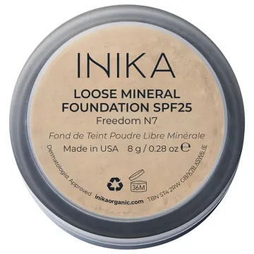 INIKA Loose Mineral Foundation SPF25 är en mineralfoundation som ger huden ett naturligt resultat med sammetslen finish. Innehåller 100% naturliga mineraler med bland annat titandioxid och zinkoxid som ger ett naturligt solskydd med solskyddsfaktor 25. Lättarbetad formula som ger en matt finish som inte täpper till porerna och kan byggas upp från medium till hög täckningsgrad. Finns i 8 nyanser: • Grace: mycket ljus med kall/neutral underton • Strength: ljus med neutral/varm underton • Unity: ljus med neutral/kall underton • Nurture: ljud till medium med varm/neutral underton • Patience: medium med varm/neutral underton • Trust: medium till mörk med varm/gyllene underton • Freedom medium till mörk med neutral/oliv underton • Inspiration: medium till mörk med varm/neutral/oliv underton