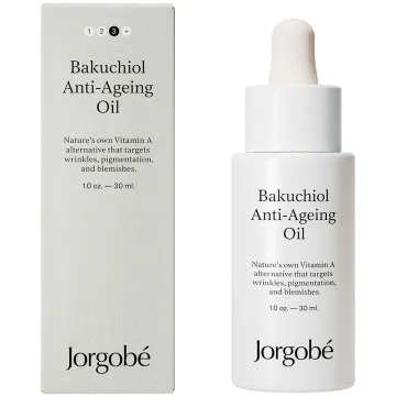 Jorgobé Bakuchiol Anti-Ageing Oil är en ansiktsolja som motverkar synligheten av fina linjer och ökar elasticiteten i huden. Den är berikad med bakuchiol, ett naturligt alternativ till retinol. Bakuchiol reducerar uppkomsten av rynkor och främjar produktionen av kollagen vilket bidrar till förbättrad hudelasticitet samt minskar rodnad och irritation. Formulan innehåller även C-vitamin och antioxidanten Q10 som motverkar pigmenteringar och ger en slät och återfuktad hud. 30 ml.