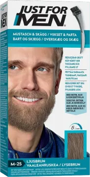 Just For Men Mustache & Beard är en färg för mustasch och skägg som är snabb och enkel att använda. Många gånger börjar skägget att få vita strån tidigt och det grå skägget matchar inte alltid hårfärgen på huvudet. Just for men skäggfärg är en färgkräm i geléform som är anpassad för att färga in även grova skäggstrån och appliceras enkelt med den medföljande borsten. Verkningstiden är endast fem minuter - första gången kan du prova en något kortare verkningstid (3-4 min) för att inte få ett för mörkt resultat. Resultatet blir naturligt och håller i upp till en månad. Färga skägget max en gång i veckan. Läs och följ instruktionerna på förpackningen noga. Light Brown / Ljusbrun (M-25).