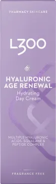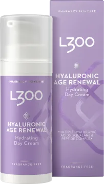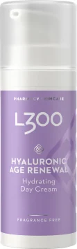 L300 Hyaluronic Age Renewal Day Cream är en återfuktande dagkräm som minskar synligheten av fina linjer och hjälper till att bibehålla hudens elasticitet. Berikad med hyaluronsyra i två olika molekylstorlekar och squalane som tillsammans tillför fukt och kapslar in den i huden för en direkt och långvarig återfuktning. Innehåller även ett peptidkomplex som bidrar till att motverka ålderstecken och hjälper till att bibehålla hudens spänst. Dermatologiskt testad och oparfymerad. Vegansk. 50ml.