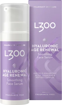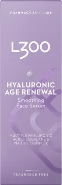 L300 Hyaluronic Age Renewal Face Serum är ett anti age-serum som återfuktar huden och hjälper till att fylla ut fina linjer. Berikad med squalane och hyaluronsyra i två olika molekylstorlekar som tillsammans tillför fukt och kapslar in den i huden för en direkt och långvarig återfuktning. Innehåller även extrakt från solblom och ett peptidkomplex som bidrar till att motverka ålderstecken och hjälper till att bibehålla hudens spänst. Passar normal till torr och mogen hy. Dermatologiskt testad och oparfymerad. Vegansk. 30 ml.