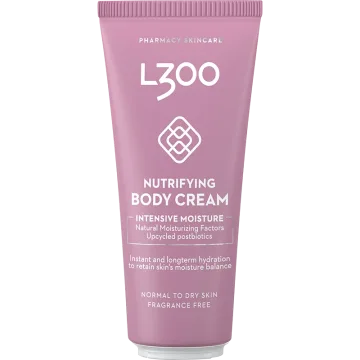 L300 Nutrifying Body Cream är en rik kroppskräm som ger huden näring samt direkt och långvarig återfuktning. Innehåller återfuktande ämnen som finns naturligt i huden som karbamid, salt, mjölksyra och betain, samt postbiotika som hjälper till att stärka hudbarriären. Ger en mjuk och återfuktad hud. Oparfymerad och dermatologiskt testad. Passar normal till torr hud. 200 ml.