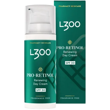 L300 Pro-Retinol Renewing Day Cream SPF 30 är en återfuktande dagkräm med anti-age egenskaper. Ansiktskrämen innehåller 0,27% pro-retinol och hjälper till att effektivt reducera rynkor och fina linjer. Den bidrar även till en förbättrad hudtextur. Fuktkrämen är även berikad med solskyddsfaktor 30 som skyddar mot både UVA- och UVB-strålar. Ceramider förser huden med näring och hjälper till att upprätthålla fuktbalansen. Krämen innehåller också havreolja som verkar lugnande, återfuktande samt stärkande för hudbarriären. Extrakt från alger har en lugnande effekt. Vegansk. Oparfymerad. 50 ml.