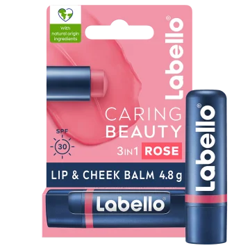 Labello Caring Beauty Rose-Nude är ett färgat läppbalsam som ger färg, återfuktar på djupet och skyddar huden med solskyddsfaktor 30. Krämig formula som är lätt att applicera och kan användas på läpparna såväl som på kinderna för att ge en vackert rosig ton. Berikad med E-vitamin, bivax och ekologisk mandelolja som ger långvarig fukt och gör att huden känns mjuk och len. Applicera flera lager för en mer intensiv färg. Dermatologiskt testad. 4,8 g.
