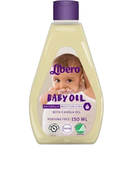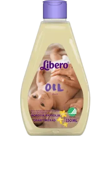 Libero Oil är en återfuktande babyolja. Den gör huden mjuk och len. Babyoljan innehåller rapsolja. Oljan används vid blöjbyte, i badet eller för babymassage. Den innehåller ingen parfym. Svanenmärkt. 150 ml.