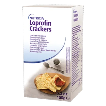 Loprofin Crackers är krispiga kex baserade på majs- och tapiokastärkelse. Kexen är fria från gluten, mjölk, laktos, ägg och soja. Loprofin lågproteinprodukter är avsedda för kostbehandling av medfödda metabola sjukdomar eller vid nedsatt njur- eller leverfunktion som kräver lågproteinkost. 150 g.