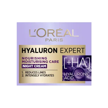 L'Oréal Paris Hyaluron Expert Replumping Night Cream Mask är en intensivt återfuktande nattkräm med anti age-effekt. Berikad med glycerin och två typer av hyaluronsyra som återfuktar och binder fukt både djupt ned i huden och på hudytan. Hyaluronsyran bidrar till att fylla ut huden och reducera intrycket av fina linjer. Fyllig formula som vårdar och mjukgör huden under natten, så att den känns mjuk och len på morgonen. Kan även användas som en återfuktande ansiktsmask. 50 ml.