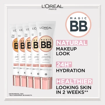L'Oréal Paris Magic BB Cream är en färgad ansiktskräm som vårdar huden och jämnar ut hudtonen. Krämen kombinerar makeup och hudvård i en vårdande formula berikad med bland annat E-vitamin, pantenol och glycerin. Pigmenten är inkapslade i krämen, ändrar färg vid applicering och ger en lätt täckningsgrad med en naturlig finish för en osminkad look. Huden känns mjuk och återfuktad i upp till 24 timmar efter applicering. Passar alla hudtyper. 30 ml.