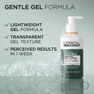 L'Oréal Paris Men Expert Derma Control Anti-Blemish Cleanser är en djuprengörande rengöringsgel som avlägsnar smuts och orenheter, samt ger en mild exfoliering som avlägsnar döda hudceller. Berikad med salicylsyra och 2% niacinamid som rengör skonsamt och effektivt, samtidigt som överflödig olja i huden reduceras och porerna rengörs på djupet. Passar fet hy med tendens till orenheter. 260 ml.