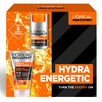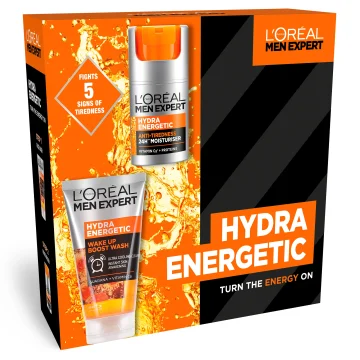 L'Oréal Paris Men Expert Hydra Energetic Presentask innehåller Anti-Tiredness 24H** ansiktskräm och Wake Up Boost ansiktsrengöring för män. Den återfuktande ansiktskrämen har en lätt, gel-liknande konsistens och hjälper till att motverka mörka ringar, matt hudton, förlorad spänst, torrhet och strävhet. Den absorberas snabbt i huden och ger en klibbfri känsla. Ansiktsrengöringen ger en uppfriskande känsla samtidigt som den rengör intensivt och effektivt. Ansiktsrengöringen innehåller bland annat guarana och vitamin Cg. Passar normal hud som känns stram och torr.