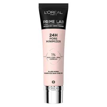 L'Oréal Paris Prime Lab Advanced Derm 24H Pore Minimizer är en primer som hjälper till att minimera synligheten av porer. Primern appliceras innan makeup som bas för att skapa ett jämnt utgångsläge och en mer hållbar sminkning. Den innehåller 1% AHA+LHA+BHA komplex. Passar utmärkt att använda under foundation eller concealer. Passar känslig hud. 30 ml.